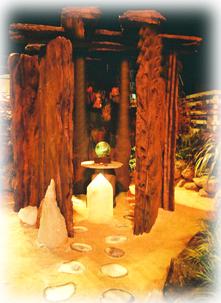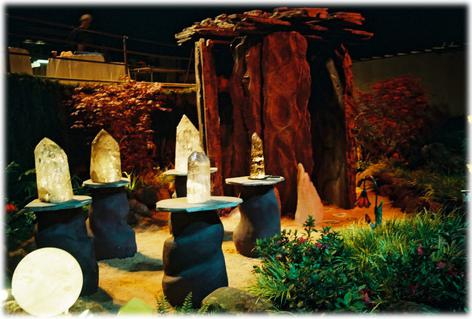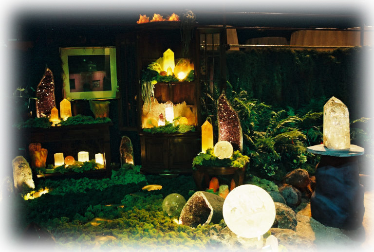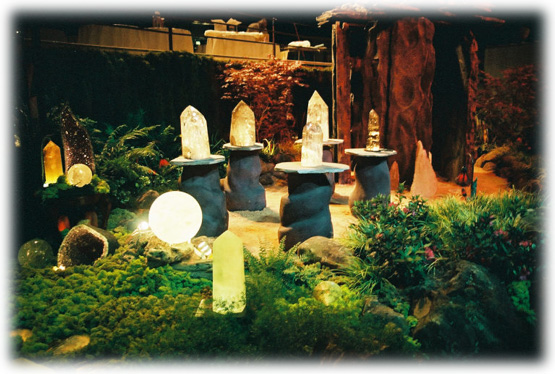 In 2003 Mystical Landscapes partnered with Forester Landscaping to show-case the beauty of crystals in a garden setting. Stone and cement bases with halogen lights were designed specifically to illustrate these possibilities, using organic shapes and natural colors. The design featured an indoor garden with dried mosses, sea shells, sponges and rustic furniture; and an outdoor garden with lighted agate stepping stones, a stone grotto and a crystal grid.